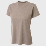 100% polyester heather tee, 4.2 oz. per square yard; Moisture management for all season comfort; Odor resistant and stain release fabric for easy care; Double needle cover-stitch hem; Reinforced shoulder seam; Tag free v-neck;