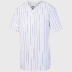 100% polyester smooth pinstripe knit * Wicks moisture * Tagless label * Full-button jersey * Buttons spaced for easy embellishment * Set-in sleeves * Fishtail bottom